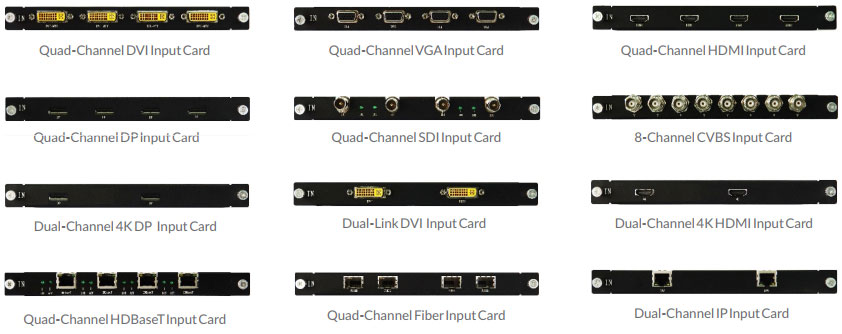 Input:VGA, DVI, HDMI, CVBS, DP, SDI, HDbaseT, IP-Video, Fiber optic, etc.