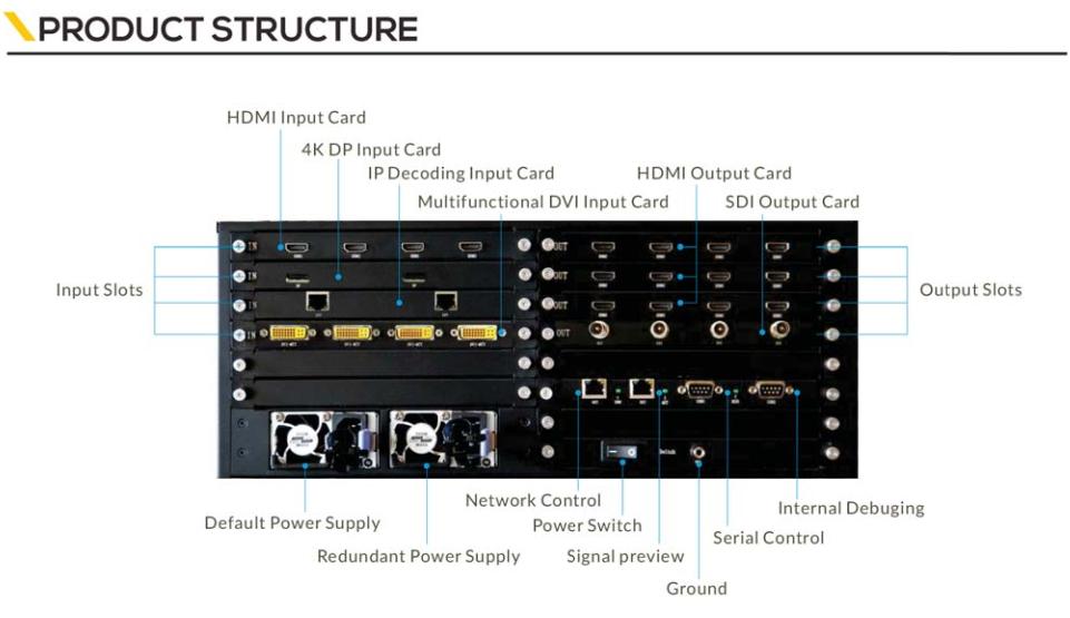Input:VGA, DVI, HDMI, CVBS, DP, SDI, HDbaseT, IP-Video, Fiber optic, etc.